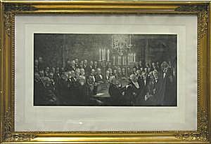 videnskabens samling. Store videnskabsmænd samlet omkring bord.